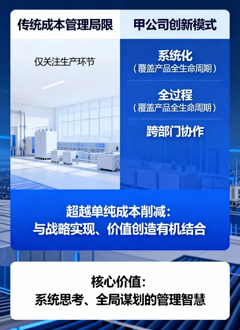 甲公司的目标成本管理实践,展示了一种系统化、全过程、跨部门协作的成本管理新模式。它打破了传统成本管理仅关注生产环节的局限,将成本控制延伸至产品全生命周期;它超越了单纯的成本削减,将成本管理与战略实现、价值创造有机结合。