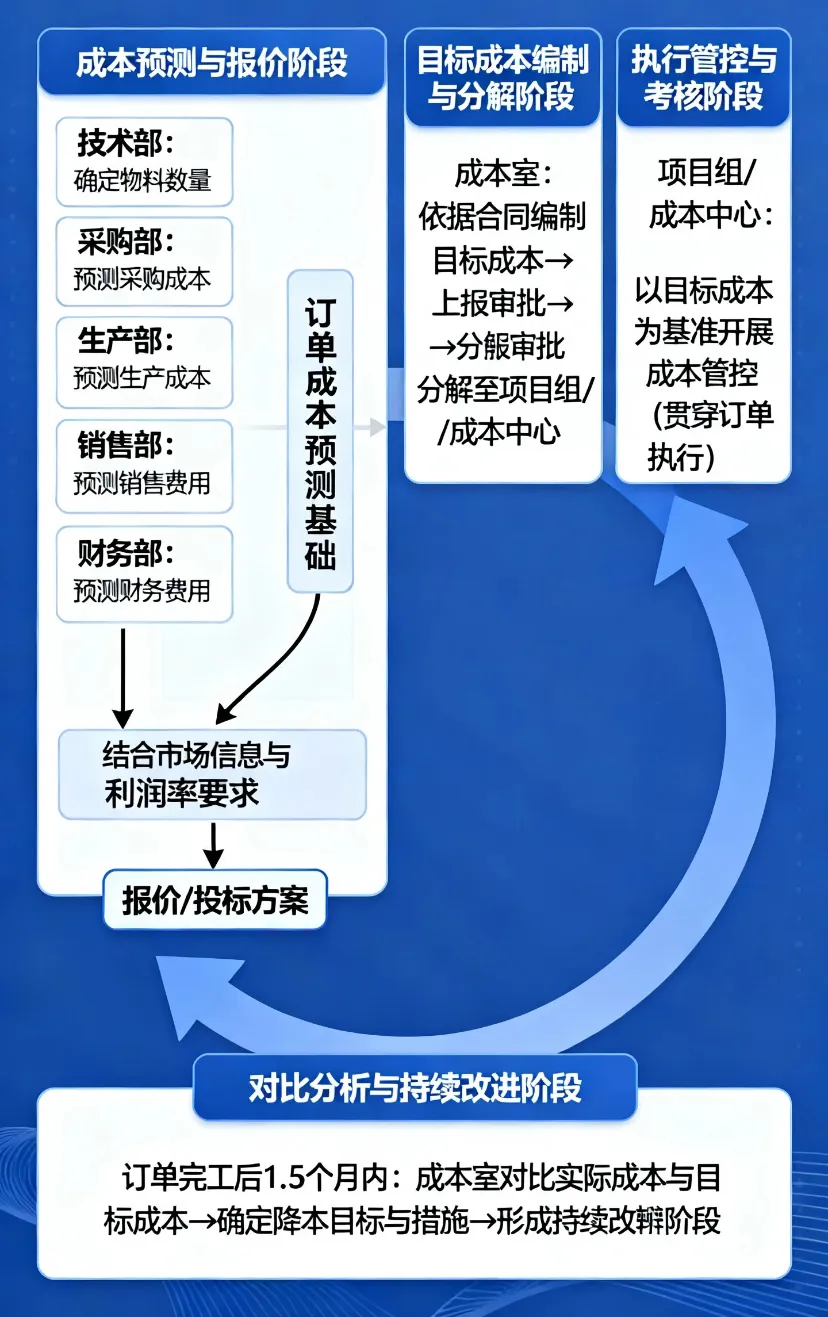 甲公司围绕订单承接、生产和交付的全周期,设计并建立了完整的目标成本管理流程,形成了从预测、分解、执行到分析的闭环管理系统。