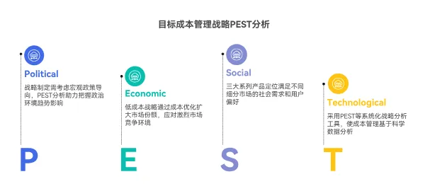 在战略落地过程中,甲公司采用了系统化的战略分析工具,包括PEST分析用于把握宏观环境趋势,SWOT分析用于认清内部优劣势和外部机会威胁。这种基于数据分析的战略制定方式,使得目标成本管理建立在科学的决策基础之上,而非主观臆断。