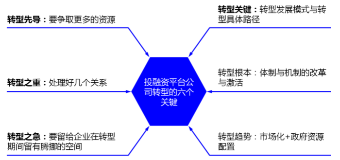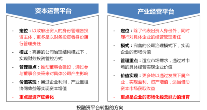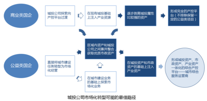 城投公司市场化转型是大势所趋。以十八届三中全会为标志,本轮国企改革正式启动,国家先后下发多项政策文件指导改革思路和具体的实施路径,央企和地方国企层面均开展了多项改革试点。随着国办发〔2017〕38号正式发布,国资委在国资监管中的定位从管人、管事、管资产变成了管资本,在管理架构上形成了“国资委-国有资本两类平台公司-国有企业”的三层架构。城市平台公司既往作为城市建设的“项目融资者”角色,伴随着城市快速发展,在经历了快速的发展与扩张后,受困于单一的角色定位,城市平台公司暴露出了“量”与“质”两个方面问题,一是动能不足,数量饱和且增长停滞,“退台”趋势逐渐明显;二是虚体发展,欠实体化且债务沉重,融资职能过度透支。对此,地方政府融资平台监管政策自2010年便已启动,2014年开始启动对债务甄别工作、整治地方政府债务问题。一方面规范政府投融资机制,另一方面剥离城市平台公司政府融资功能,促使平台公司重新定位和转型升级。在此背景下,如何实现市场化转型,是新形势下地方国企改革和城投发展工作面临的重要课题,对国有企业的发展、政府债务的化解都具有重要意义。目前来看,国内城投类企业发展现状大概呈现以下特点:非发达地区的城投公司多数仍是“名亡实存”的政府融资平台,企业发展质量与当地经济发达程度高度一致,城投的区域内资产管理功能越发显露;城投市场化转型面临的主要问题大致如下:政府投融资平台职能难以真正剥离,历史债务负担较重拖累发展步伐,现代化企业经营管理制度难以有效建立,缺乏专业化的经营人才,缺乏多元化的产业布局,缺乏经济效益较好的优质资产。也有地方政府及职能部门仍处观望状态,缺乏方向或信心,未见实质性行动。
