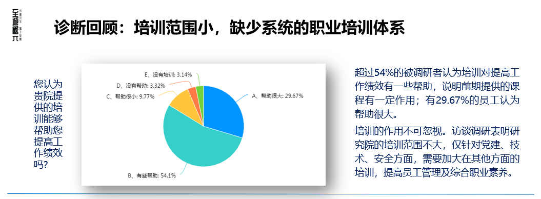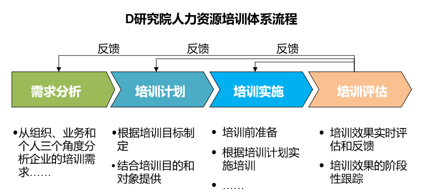 由象元咨询公司两位资深导师协助开展的内部培训,从项目初衷出发,为D研究院设计并实施了计划与目标管理、绩效面谈技巧、管理者角色定位与下属培养、跨部门沟通技巧等课程。此次培训使全院60多名中高级管理人员对现代企业管理体系、市场化运营理念以及职业经理人角色有了更深刻的理解,为研究院的市场化转型奠定了坚实的组织与人才基础。