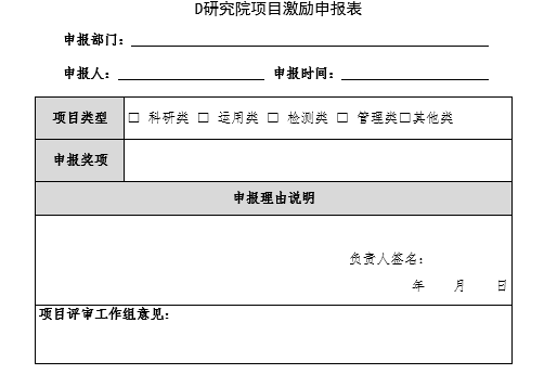 设立“年度创新奖”“质量标兵”等称号,与晋升、评优挂钩,激励员工积极进取(以下为项目激励的申报表)。