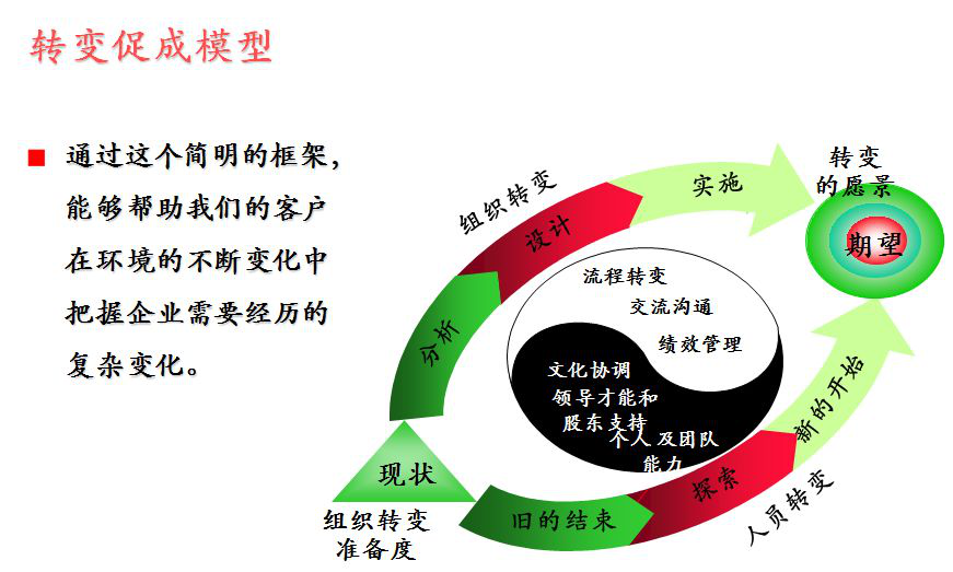 大部分组织转型涉及两个方面。首先,涉及结构转型。结构转型将带来新流程、新技术、新的组织设计和治理结构的产生。其次,涉及行为转型。行为转型确保员工接受变更、调整心理模式和工作方式,从而保证变革的影响可以强化并能够持续。