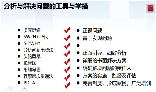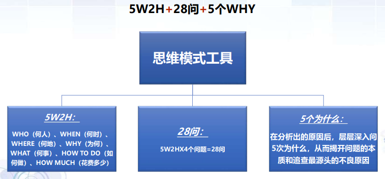 通过锻炼思维,我们希望能够提高管理者透过现象看本质,解决工作难题的能力。当然在此之前我们需要分析问题,找出根源。首先根据分析的步骤剖析现象,层层深入提问5个为什么,逐步揭开问题的本质及原因。要分辨此处的5个为什么不等于问5次为什么,关键在于找到根本原因。在分析问题时可运用思维工具:5W2H+28问+5个WHY。通过课堂模拟练习,学员能够实地操作思维工具,从而找到问题的根源。