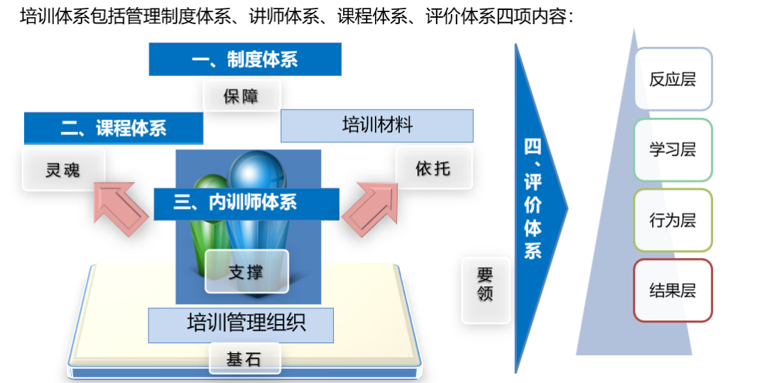 企业建立培训体系并不难,因为初期可以聘请专业的咨询公司解决,难在怎样使这个体系按照设定的方向和轨道持续运行并实施改进。调研发现,在已经建立培训体系的企业里,成功运行的概率不到50%,因为成功的培训体系一方面需要企业的持续投入,另一方面,更需要企业内部的“牵引”和“推动”。