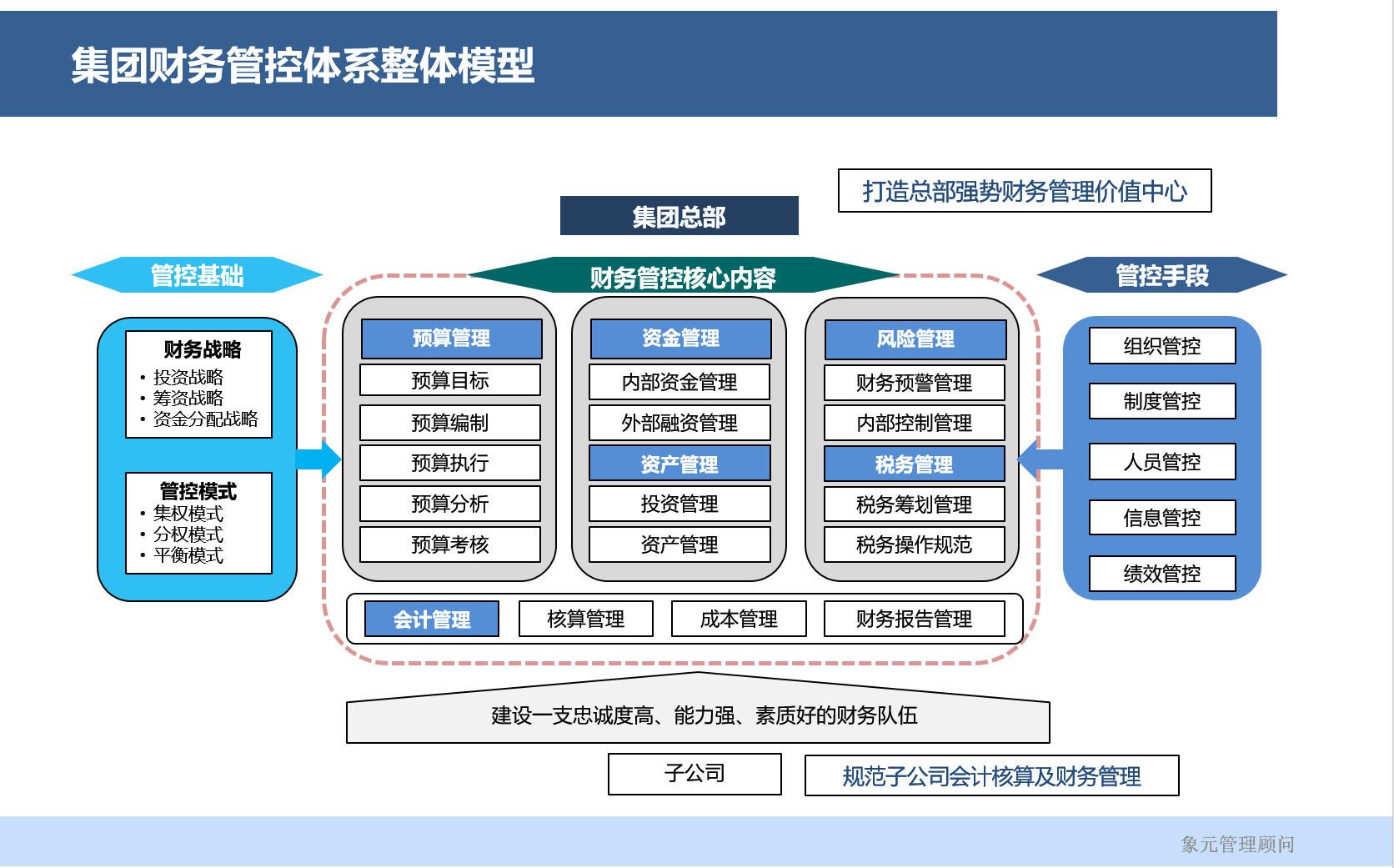 财务管理和控制是相辅相成的,财务管控是企业发展到一定规模后(集团化)的重要管理手段,它是在集团战略规划的指导下,通过对财务管理权限及涉财人员管理权限的合理分配,保障企业资本、资产及资金的有效使用,确保专项汇报体系的专业化,确保企业完成经营计划和战略目标。同时,财务管控也是集团总部控制成员企业的最重要方法,通过对财务资源的统一配置、资金的统一调度、资产的统一管理、资本及产权的统一控制、预算和决算的统一管理以及核算的统一作业,内部定价原则的制定、关联交易的抵减安排、税筹原则及银行关系的统筹规划等,实现集团对成员单位的有效管控。财务管控进一步考验了财务人员的专业能力及职业素养,在以价值型总部打造为目标的集团化管理进程中,一旦财务控制无力或失败,必将给企业的整体管理带来极为被动甚至失控的局面。