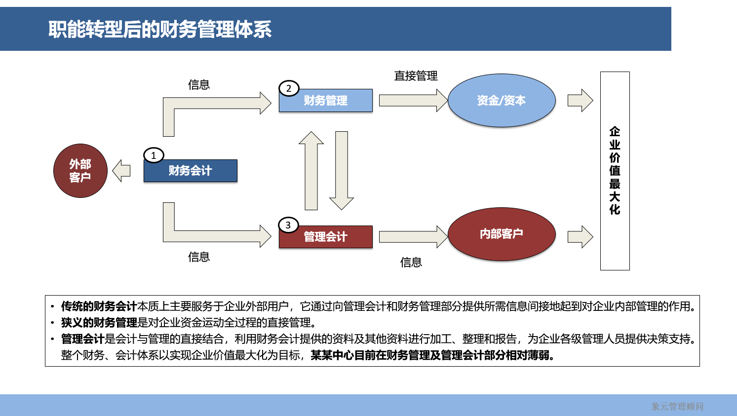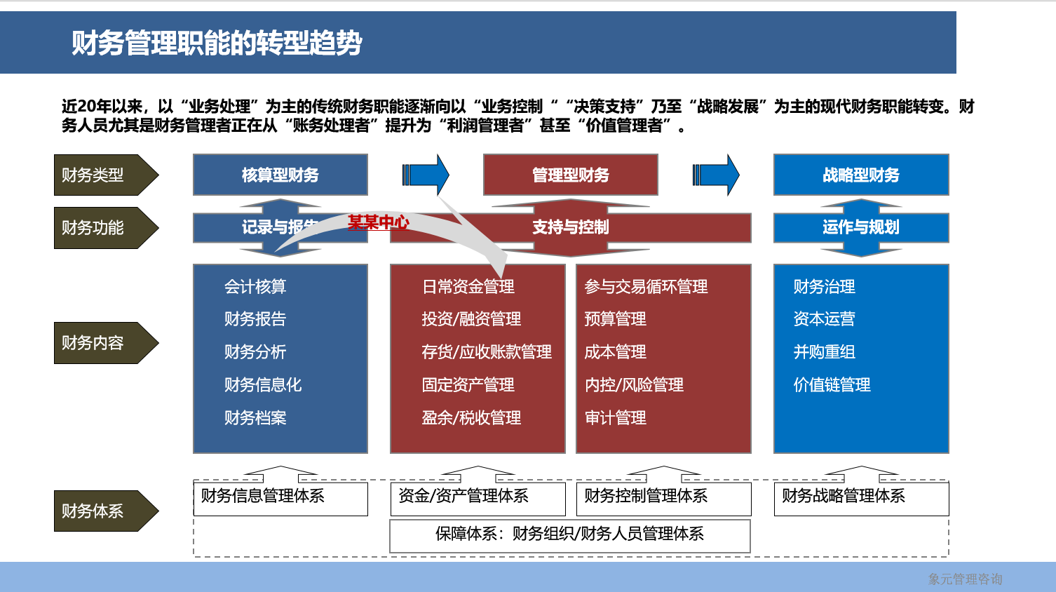 近20年来,国内财务职能在企业中的角色已经发生了显著的变化。这一转变不仅体现了财务领域的专业进步,也反映了商业环境对企业运营要求的不断升级。过去,也就是传统的管理模式,财务部门的主要工作是业务处理,包括记账、报表编制等基础的账务处理任务。然而,随着企业规模的扩大和业务复杂性的增加,传统的财务职能已经不能满足现代企业的需求。因此,财务职能逐渐向业务控制、决策支持乃至战略发展等更高级别的方向转变。