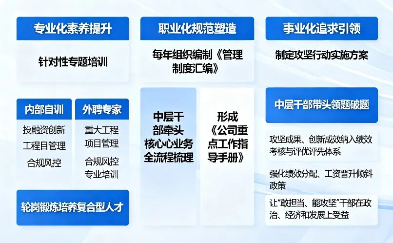 1.专业化素养提升:开展针对性专题培训,采用“内部自训”与“外聘专家”相结合方式,开展投融资创新、重大工程项目管理、合规风控等专业培训,同时推行轮岗锻炼,培养复合型人才。