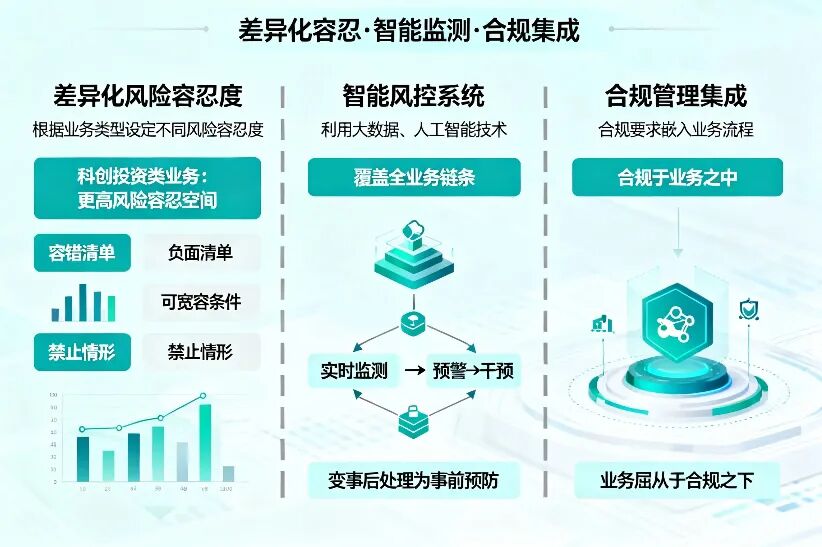 1.差异化风险容忍度:根据业务类型设定不同风险容忍度,特别是对科创投资类业务,给予更高风险容忍空间,建立“容错清单”和“负面清单”,明确创新活动中可宽容条件和情形。
