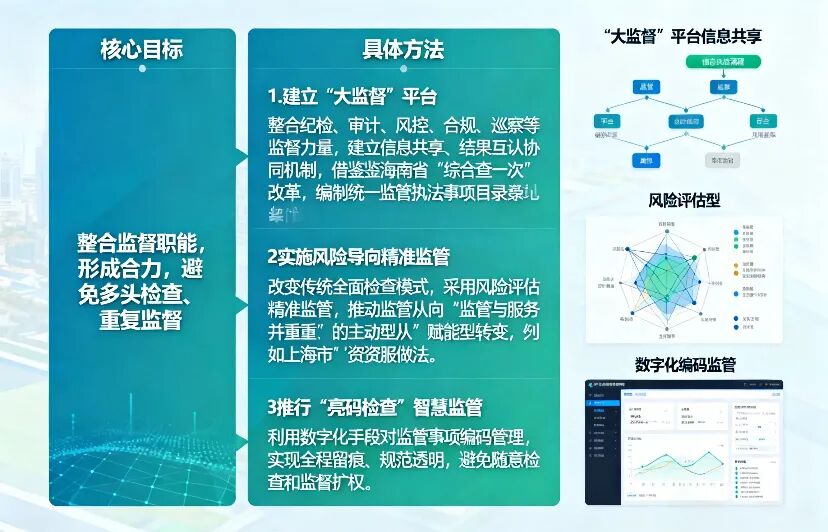 1.建立“大监督”平台 :整合纪检、审计、风控、合规、巡察等监督力量,建立信息共享、结果互认的协同机制,可借鉴海南省“综合查一次”改革,编制统一监管执法事项目录清单,减少对企业正常经营的影响。