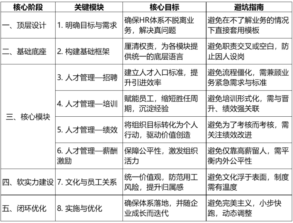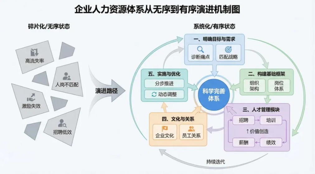 从0到1搭建人力资源体系,本质上是将企业的人才管理从经验型、碎片化状态,逐步引向系统化、专业化的轨道。这是一项需要耐心和智慧的工程,不可能一蹴而就,也没有标准答案。关键在于始终围绕企业战略和业务需求,抓住核心痛点,循序渐进推进;始终关注实际效果而非形式完美,让体系真正服务于人才发展和价值创造;始终秉持动态优化的理念,让体系随着企业成长而不断进化。