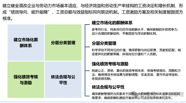 首先,混改企业通过引入非国有企业的管理理念和机制,打破了传统的“铁饭碗”制度,实现了员工能进能出的灵活用工机制。例如,通过契约化管理,员工对岗位目标负责,岗位承接企业目标,企业目标承接发展战略,从而实现了人力资源的优化配置和高效利用。其次,混改企业坚持效益导向和市场驱动的原则,构建了收入能增能减的激励约束机制。在工资总额不变的情况下,工资收入向能为企业创造更多价值的岗位倾斜,同时取消无责任工资,保留部分基本固定收入(基本工资),按比例设置浮动收入与岗位业绩相关联(绩效工资),较好地实现了“多劳多得、少劳少得、不劳不得”的收入分配原则。