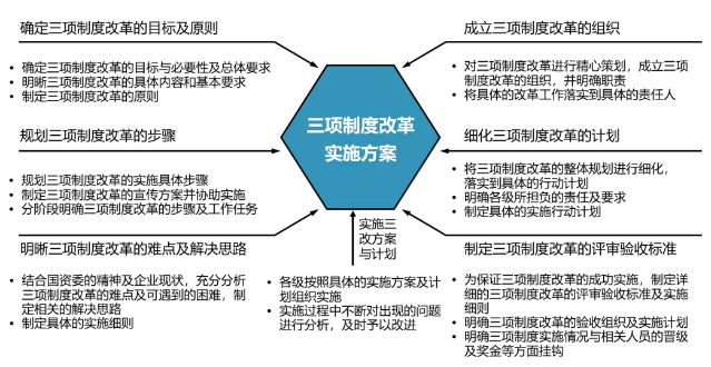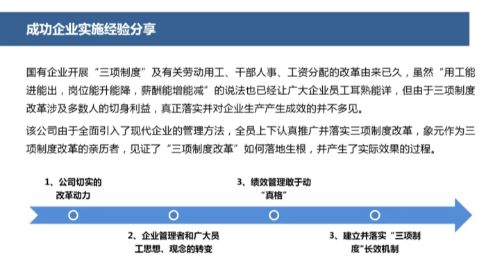 第三,明确三项制度改革的实施步骤,成立领导及实施小组,加强领导,发挥党政工团的作用,并做好三改实施前期周密的策划与规划。
