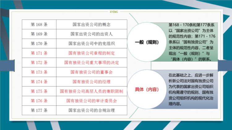 针对国企改革中遇到的特殊问题,新《公司法》作出了相应的特别规定。这些规定不仅有助于解决实际问题,还能更好地保护国有企业职工的权益,为改革的顺利进行提供了法律支持。这些特别规定,如对公司并购、重组、破产等方面的规范,为国企改革提供了明确的指导,确保了改革的正确方向和有效性。例如:新《公司法》对国家出资公司进行了特别规定,将原先公司法第四节“国有独资公司的特别规定”调整为专章,即第七章“国家出资公司组织机构的特别规定”。这一调整反映了新《公司法》对国有企业的重视,以及对国有资本控股公司的纳入,优化了国家资本的运营和监管。总览新公司法第七章“国家出资公司组织机构的特别规定(168-177)”,从规定内容可列以下条文主旨: