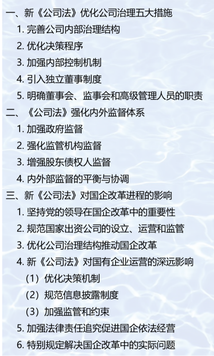 随着对2024年7月1日生效的新《公司法》的深入学习和实践应用,我们能够深刻感受到其对国企改革的巨大推动作用以及为企业可持续发展奠定的坚实基础。新《公司法》不仅在保障职工合法权益、完善中国特色现代企业制度方面提供了坚实的法律支撑,更为国企改革指明了市场化、法治化、国际化的方向。