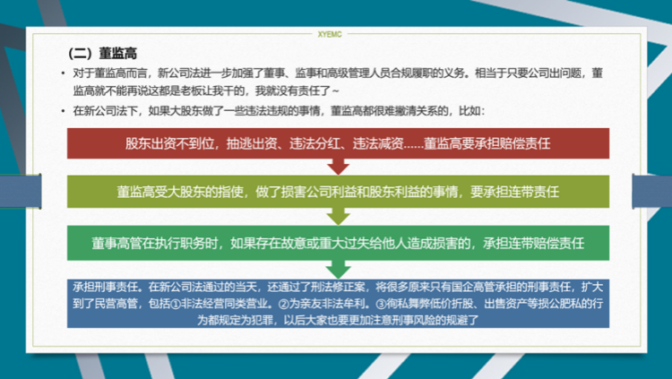 同时,新公司法还强化了对控股股东、实际控制人、董事、监事、高级管理人员的责任要求,并规定了“事实董事”、“影子董事”也要承担忠实义务、勤勉义务,对侵害公司或股东利益的行为承担相应的法律责任。