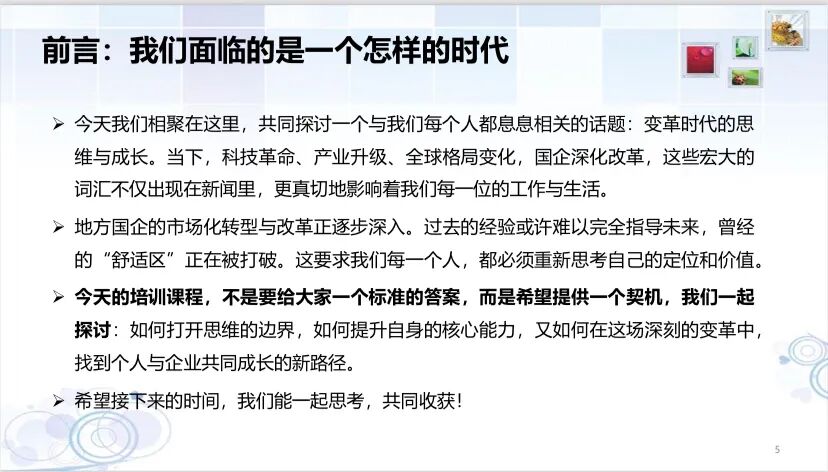 培训伊始,刘老师便带领大家深入探讨了我们所处的时代。这是一个充满不确定性的时代,科技的飞速发展让传统行业面临着前所未有的挑战,产业升级的步伐也在不断加快。在全球格局的深刻变化中,国企深化改革成为大势所趋。过去的经验在新的时代背景下,或许已经难以完全指导未来,曾经的“舒适区”正被逐渐打破。在这样的大环境下,我们每一个人都必须重新思考自己的定位和价值。