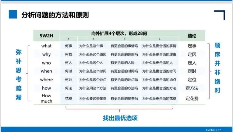 5W2H分析法是一种常用的分析工具,它包括Who(何人)、When(何时)、Where(何地)、Why(为何)、What(何事)、How(如何做)和How Much(花费多少)。通过这七个问题并展开自问或提问,当事人可以全面地了解问题的各个方面,从而更准确地把握问题的核心。在实际应用中,我们可以通过逐层深入地提问,进一步挖掘问题的根源。比课堂事例所展示,如何组织一场高效的经营分析会议,通过5W2H分析法有序展开将得以很好地实现。