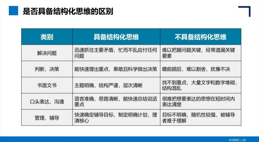 在培训中,刘老师重点介绍了结构化思维的重要性。结构化思维是一种将复杂问题分解为简单部分的思维方式,通过逻辑清晰的框架进行思考和表达。这种思维方式在工作场景中具有极高的价值,它能够显著提高工作效率,帮助我们快速抓住问题的核心,避免无效沟通,减少负面影响。
