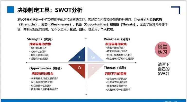 SWOT分析是一种广泛应用于规划和决策的工具。它通过评估分析对象的优势(Strengths)、劣势(Weaknesses)、机会(Opportunities)和威胁(Threats),全面了解其内外部环境,并制定相应的战略。SWOT分析不仅适用于企业、团队,也适用于个人发展。通过SWOT分析的课堂练习和展示,学员们更好地了解了自己的优势和劣势,懂得了未来如何抓住机会,应对挑战。
