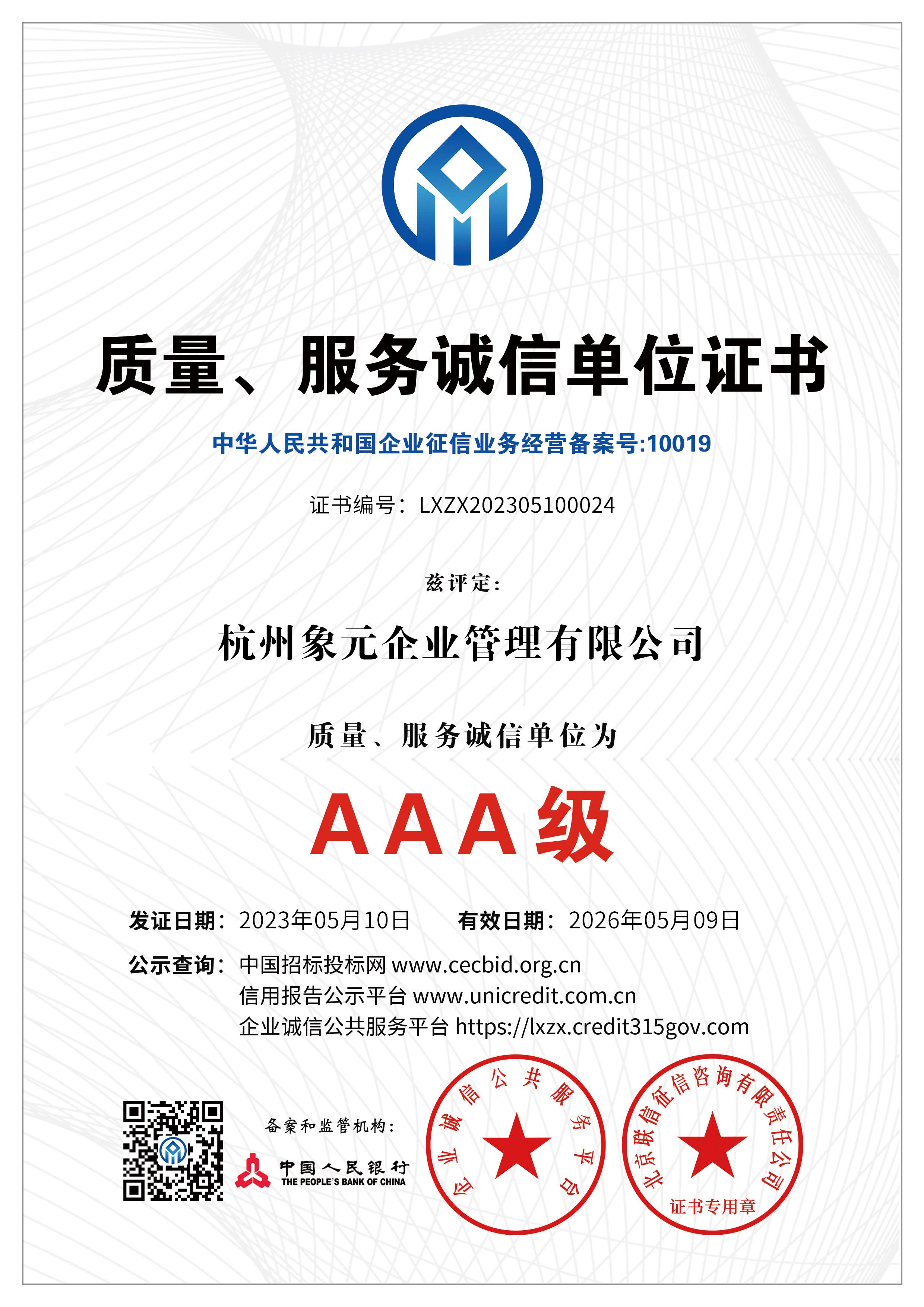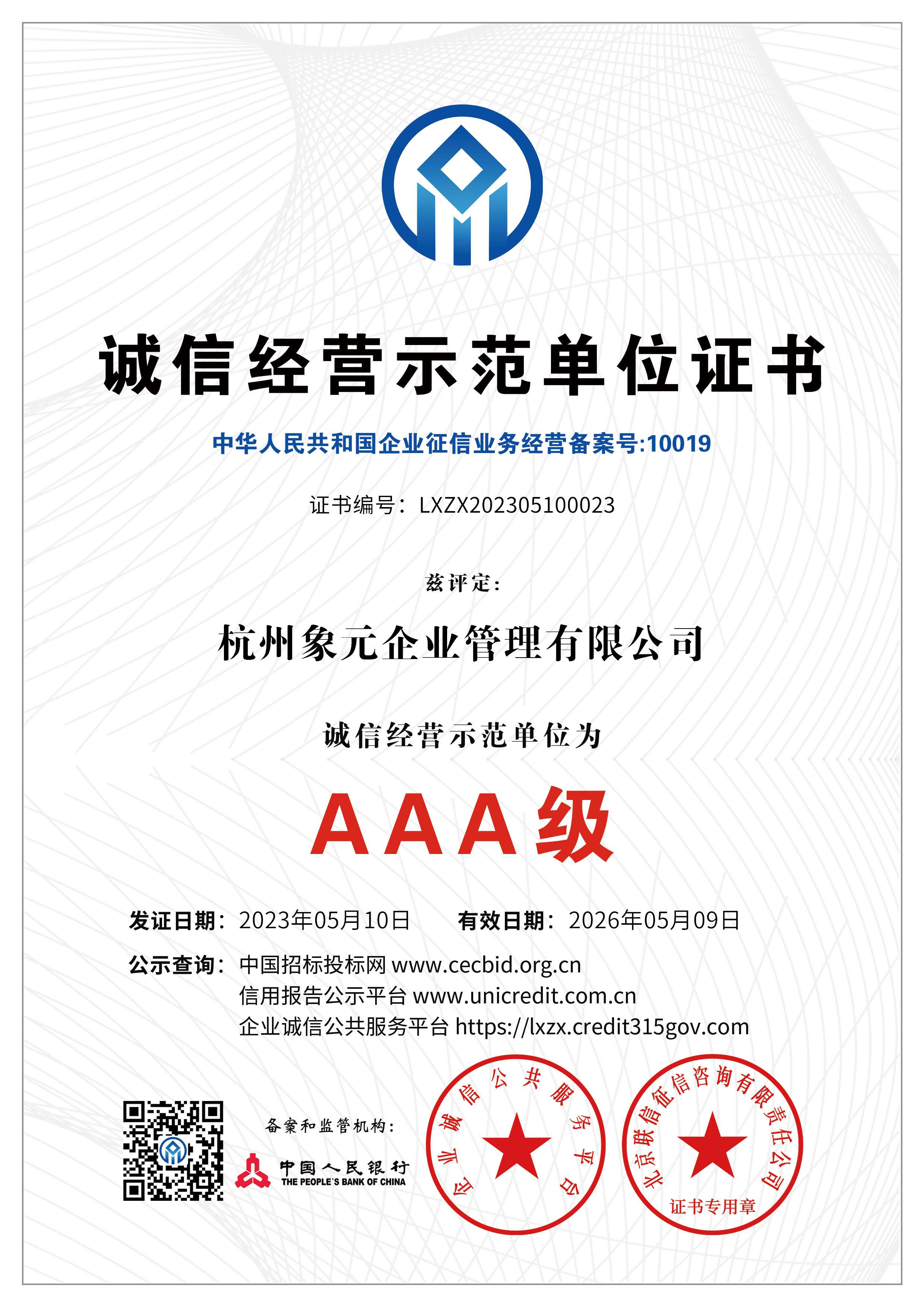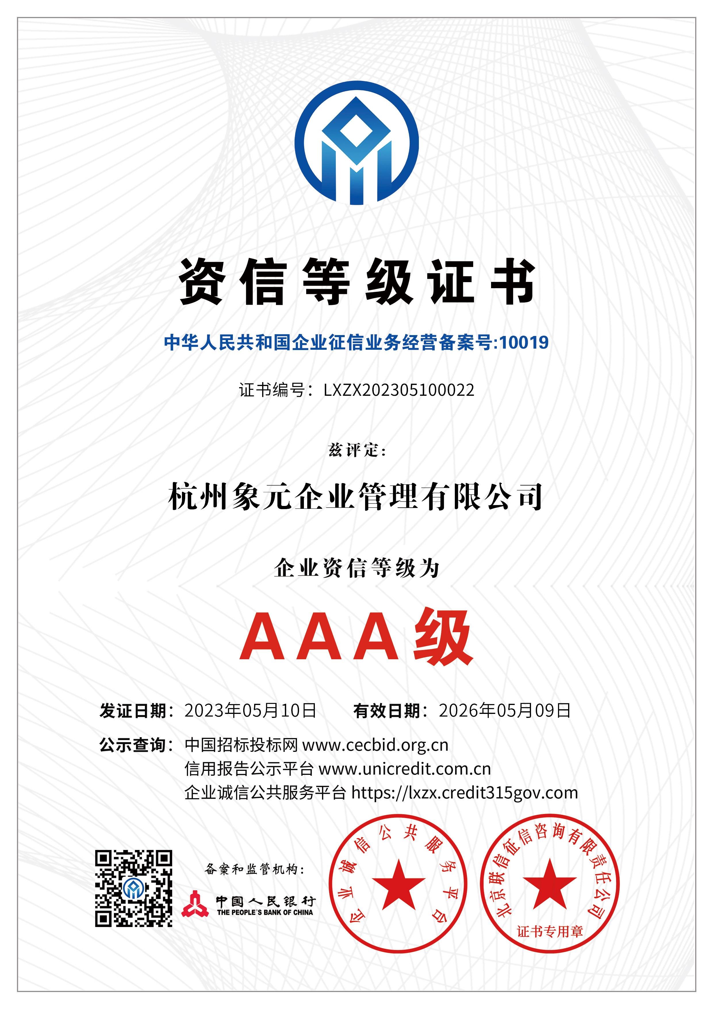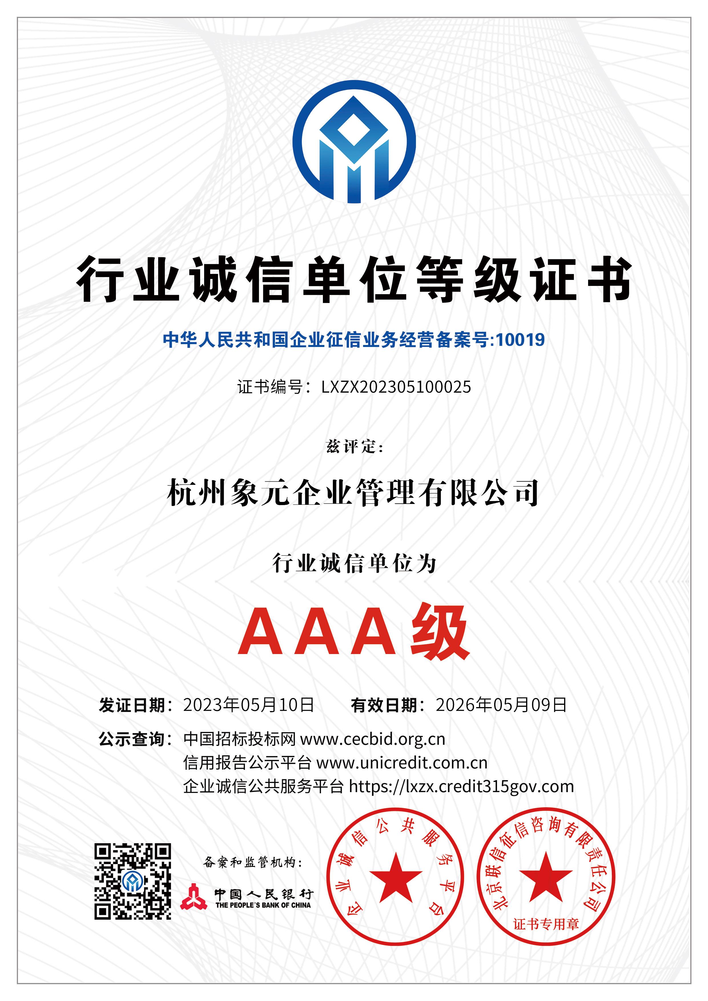 杭州象元已经于2023年5月9-10日获得数项AAA认证: