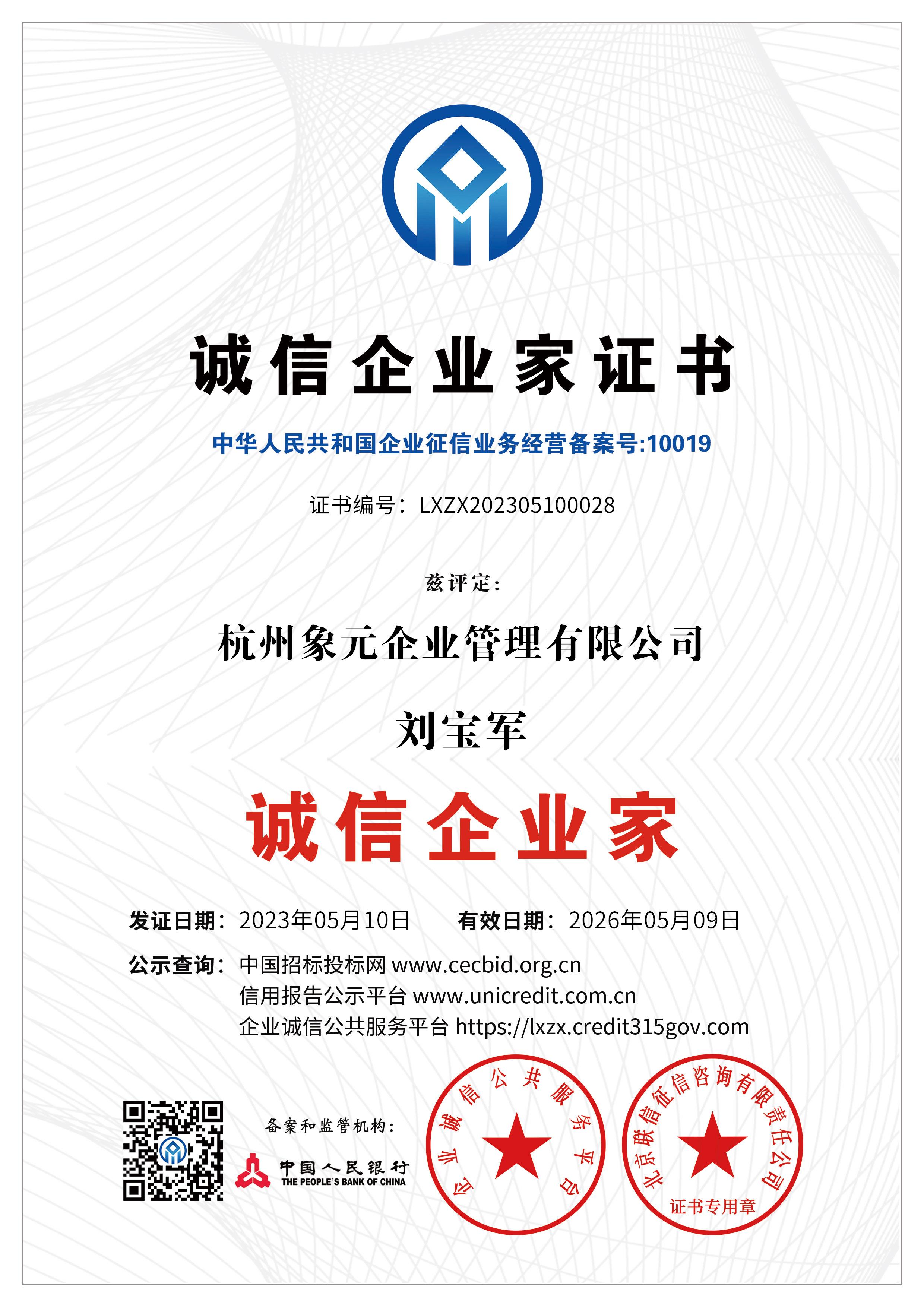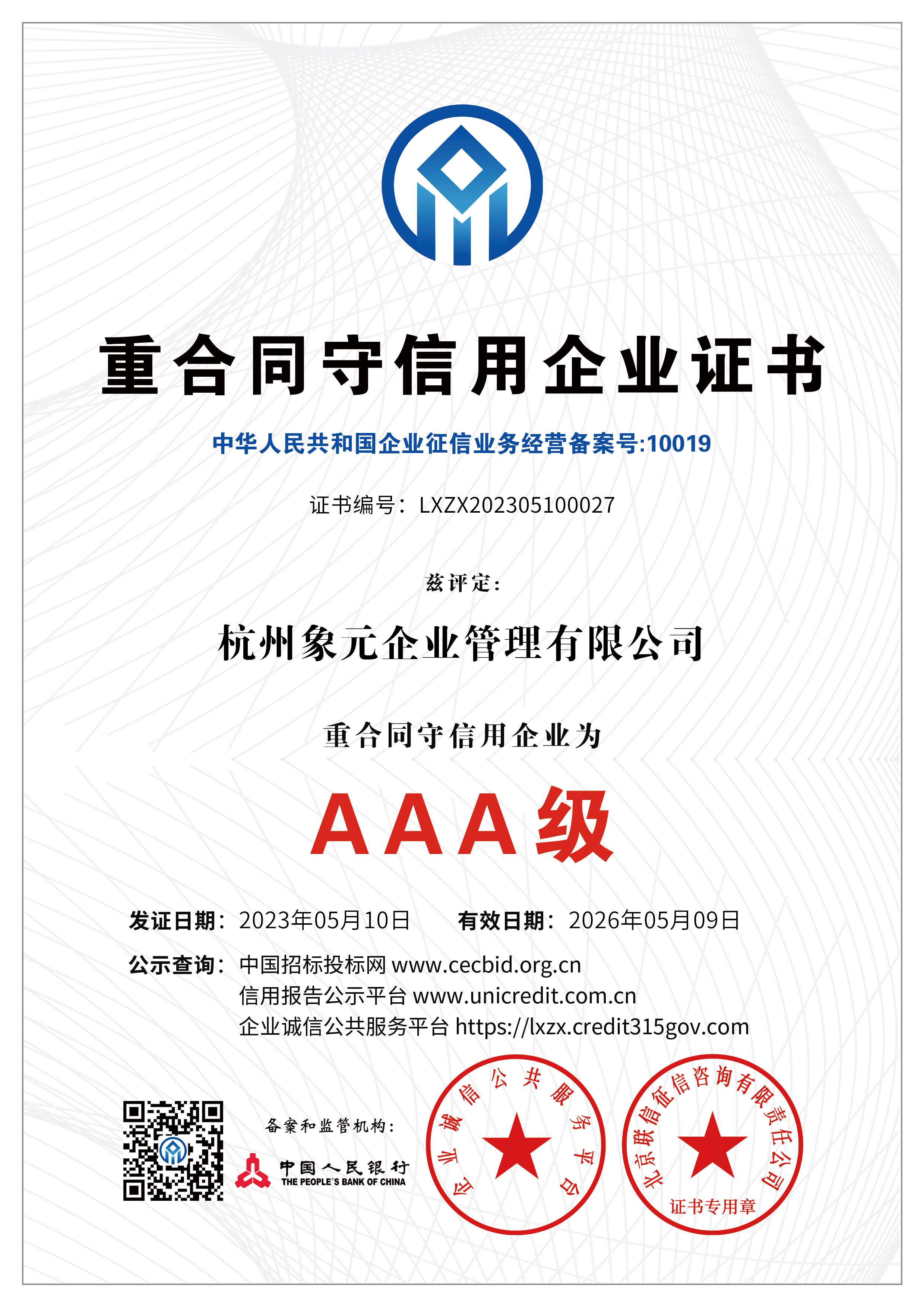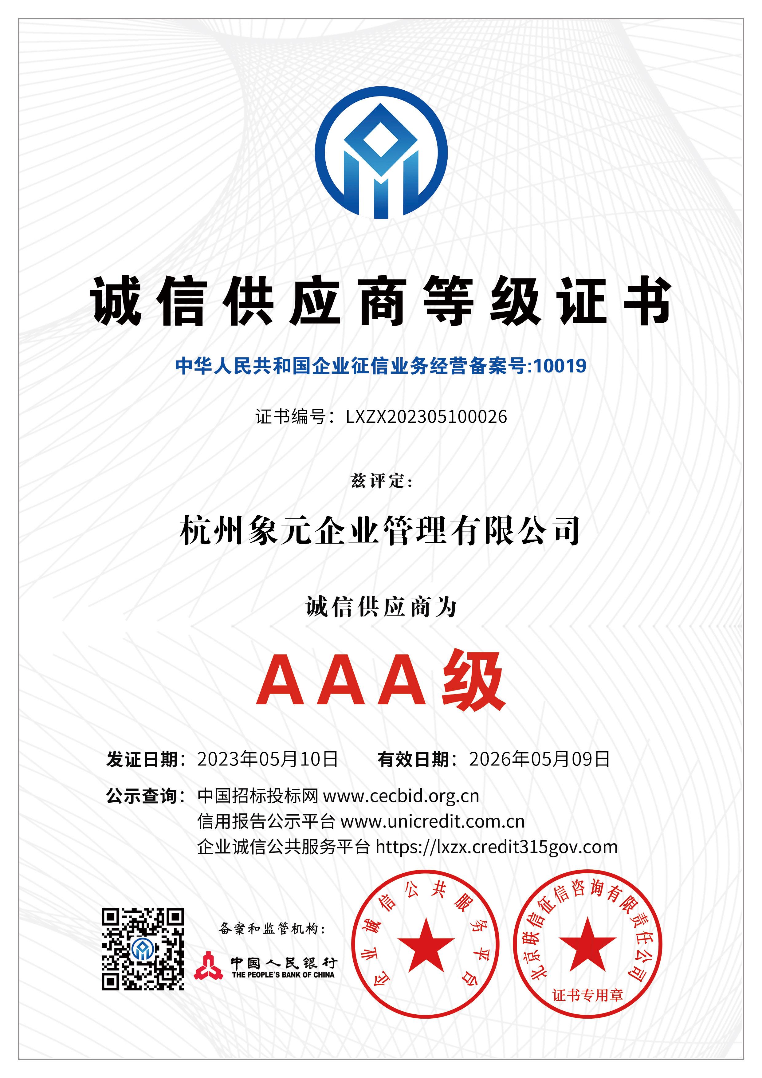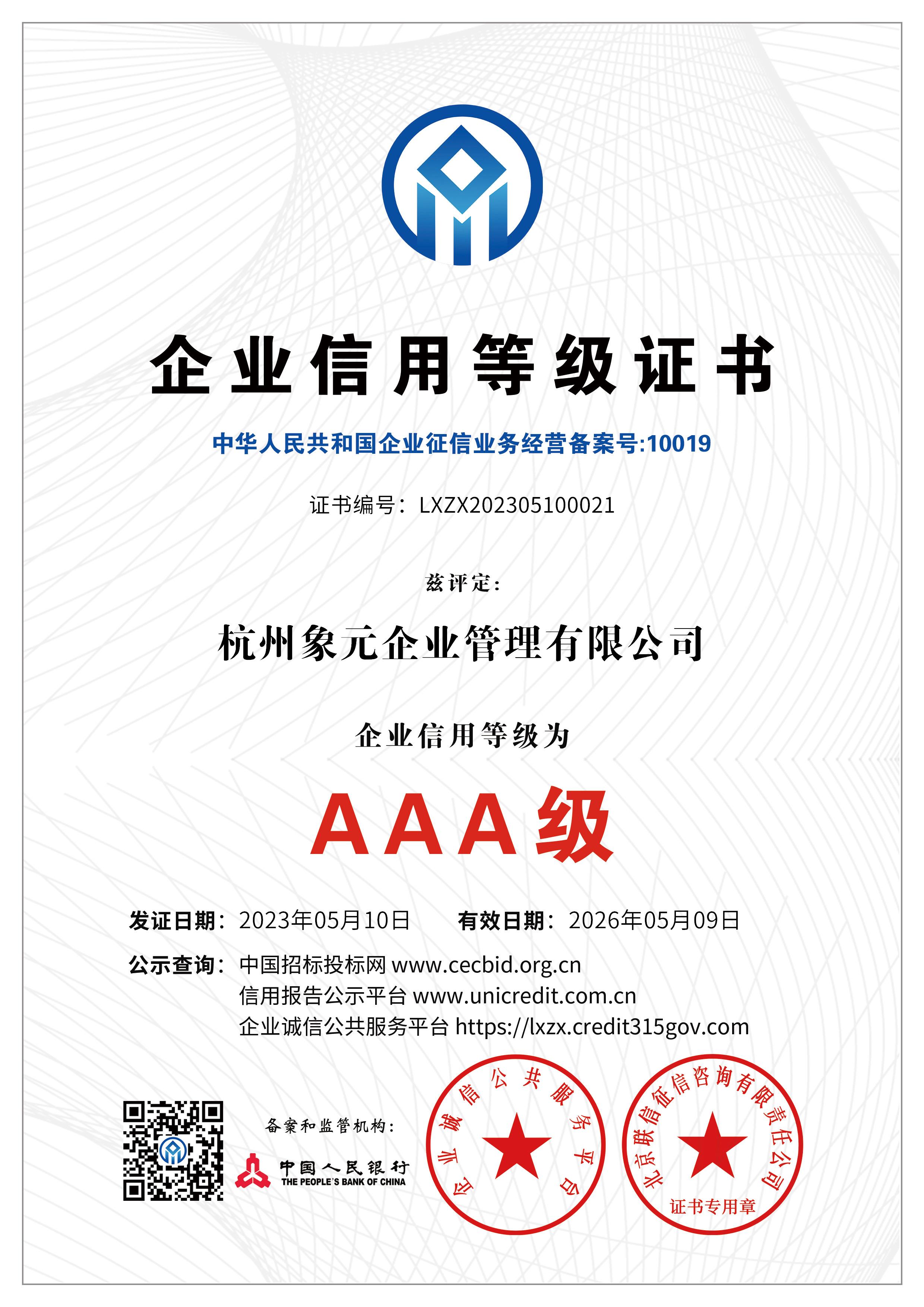 杭州象元已经于2023年5月9-10日获得数项AAA认证: