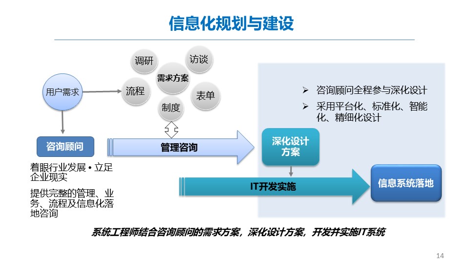 象元将根据经营战略及流程重组的需要,结合前期管理咨询业务,建立适用的信息技术方案,配合信息化的进程,彻底改善企业的内部运作效率,助力企业的战略发展。通过象元的整体方案和协同资源配置,可以为高需求的客户提供基于BI&AI(商务智能和人工智能)的整体解决方案,真正实现管理与决策的系统化和智慧化。象元已经成功与甲方及信息系统集成商合作,作为管理技术的专业角色代表甲方与信息化公司相互取长补短,实现无缝链接。